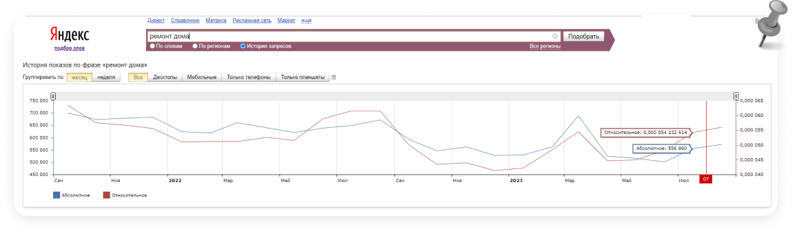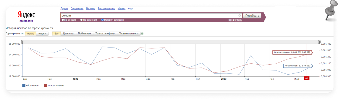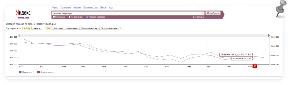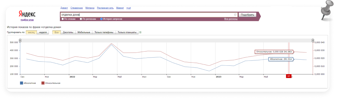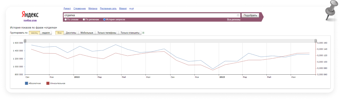 Рынок строительных материалов изголодался после Ковида, ухода зарубежных компаний и санкций. Ежемесячно более миллиона людей интересуются отделкой по всей России. Данные из Wordstat это только подтверждают: